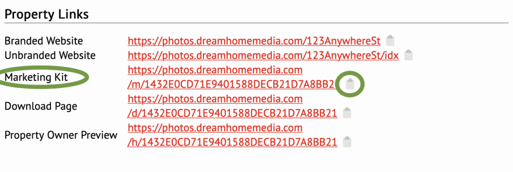 Branded & Unbranded single property websites for your listing. Simply click on the clipboard icon after the link address to copy the link. Then paste it into the MLS, an email, social media or where ever you need to share it. Unbranded links for the MLS will take visitors to a property site with no agent information.